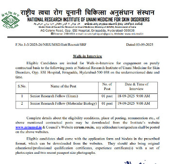 Walk-in Interview for the post of Senior Research Fellow (Unani), National Research Institute of Unani Medicine for Skin Disorders, Hyderabad.