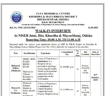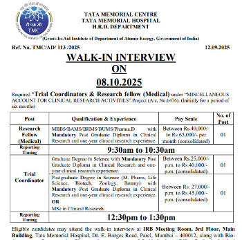 Walk-in Interview for the post of Research Fellow (Unani), Tata Memorial Centre, Mumbai.