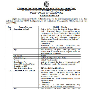 Walk-in Interview for the post of Consultant Arogya (Unani), Central Council For Research In Unani Medicine, New Delhi.