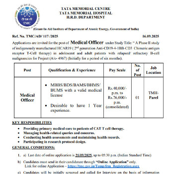 Vacancy for the post of Medical Officer (Unani), Tata Memorial Centre, Mumbai.