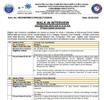 Walk-in Interview for the post of Research Fellow (Medical-Unani), TMC-Mahamana Pandit Madan Mohan Malviya Cancer Centre, Varanasi.
