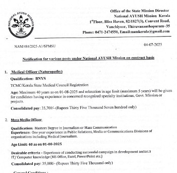 Vacancy for the post of Medical Officer (Naturopathy), National AYUSH Mission, Kerala.