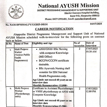 Walk-in Interview for the post of Yoga Instructor, National AYUSH Mission, Alappuzha.