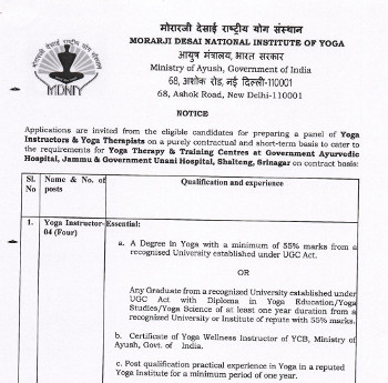 Vacancy for the posts of Yoga Instructor & Yoga Therapist, Morarji Desai National Institute of Yoga, New Delhi.