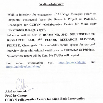 Walk-in Interview for the post of Yoga therapist, Postgraduate Institute of Medical Education & Research, Chandigarh.