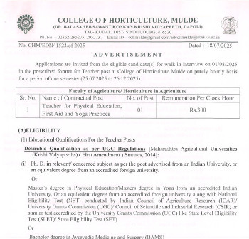 Walk-in Interview for the post of Yoga Teacher, Dr. Balasaheb Sawant Konkan Krishi Vidyapeeth, Ratnagiri.