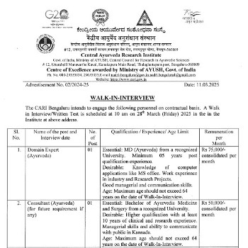 Walk-in-Interview for the post of Senior Research Fellow (Yoga), Central Ayurveda Research Institute, Bengaluru.
