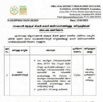 Vacancy for the post of Yoga Demonstrator, National AYUSH Mission, Ernakulam.
