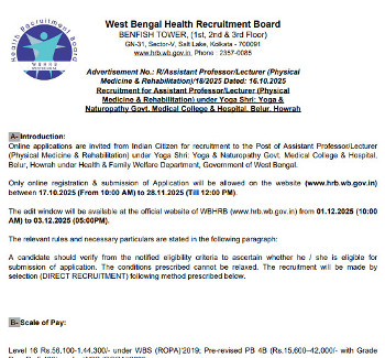 Vacancy for the post of Assistant Professor/Lecturer (Physical Medicine & Rehabilitation) (Yoga & Naturopathy), West Bengal Health Recruitment Board, Howrah.