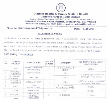 Walk-in Interview for the posts of Yoga Instructor, District Health & Family Welfare Samiti, Diamond Harbour.
