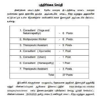 Vacancy for the post of Consultant (Yoga & Naturopathy), District Health Society, Tamil Nadu.