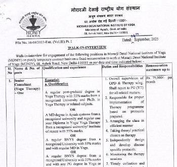 Walk-in Interview for Various Yoga & Naturopathy posts, Morarji Desai National Institute of Yoga, New Delhi.