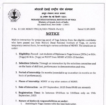 Walk-in Interaction for the post of Yoga Interns, Morarji Desai National Institute of Yoga, New Delhi.
