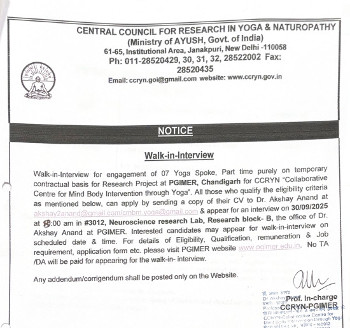 Walk-in Interview for the post of Yoga Spokes, CCRYN-Postgraduate Institute of Medical Education & Research.