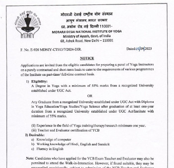 Walk-in Interview for the post of Yoga Instructors, Morarji Desai National Institute of Yoga, New Delhi.