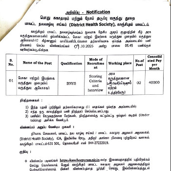 Vacancy for the post of Medical Consultant (Yoga and Naturopathy), District Health Society, Kancheepuram.