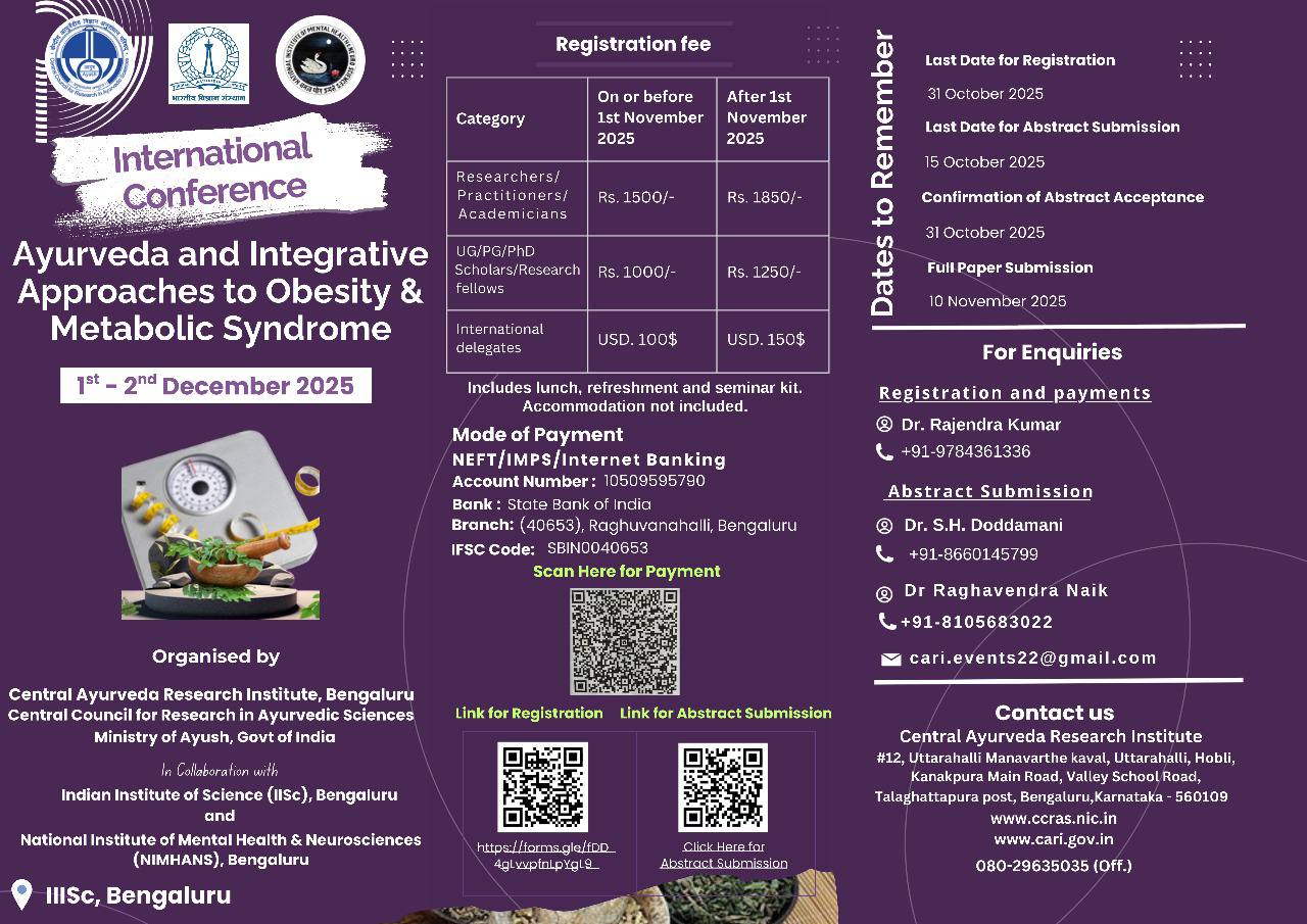 International Conference on Ayurveda and Integrative Approaches to Obesity & Metabolic Syndrome, Organized by Central Ayurveda Research Institute, Bengaluru.