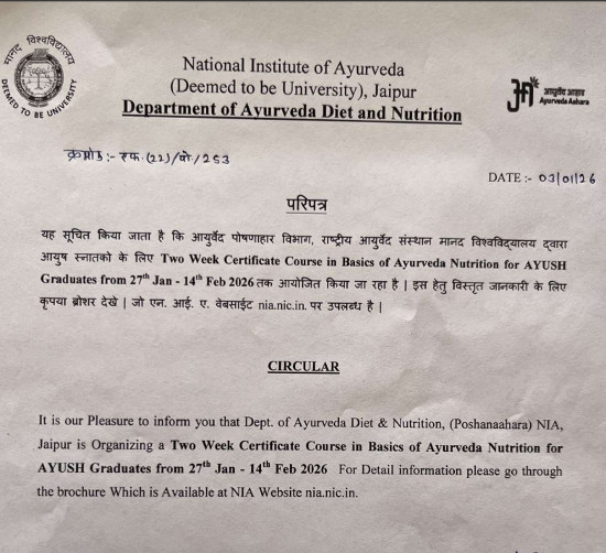 Admission Notice for Two Week Certificate Course in Basics of Ayurveda Nutrition for AYUSH Graduates, National Institute of Ayurveda, Jaipur.