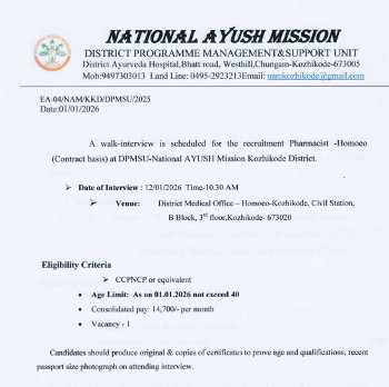 Walk-in Interview for the post of Pharmacist - Homeo, National AYUSH Mission, Kozhikode.