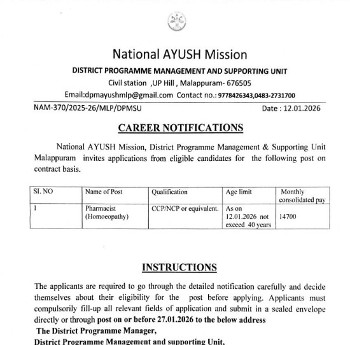Vacancy for the post of Homeopathy Pharmacist, National AYUSH Mission, Malappuram.
