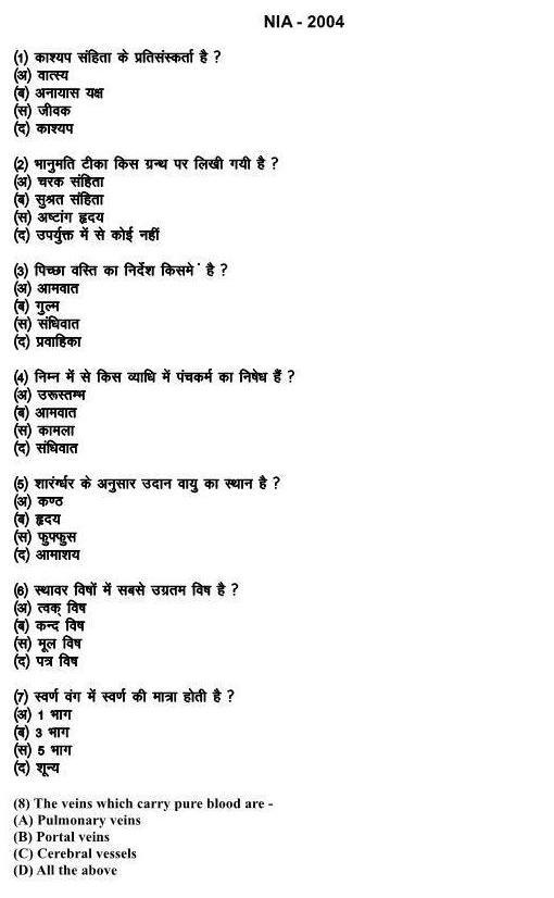 NIA, Jaipur Ayurveda PG Entrance examination 2004 Test Paper