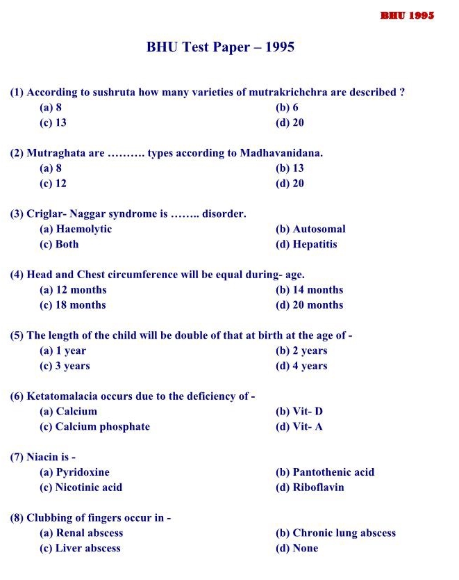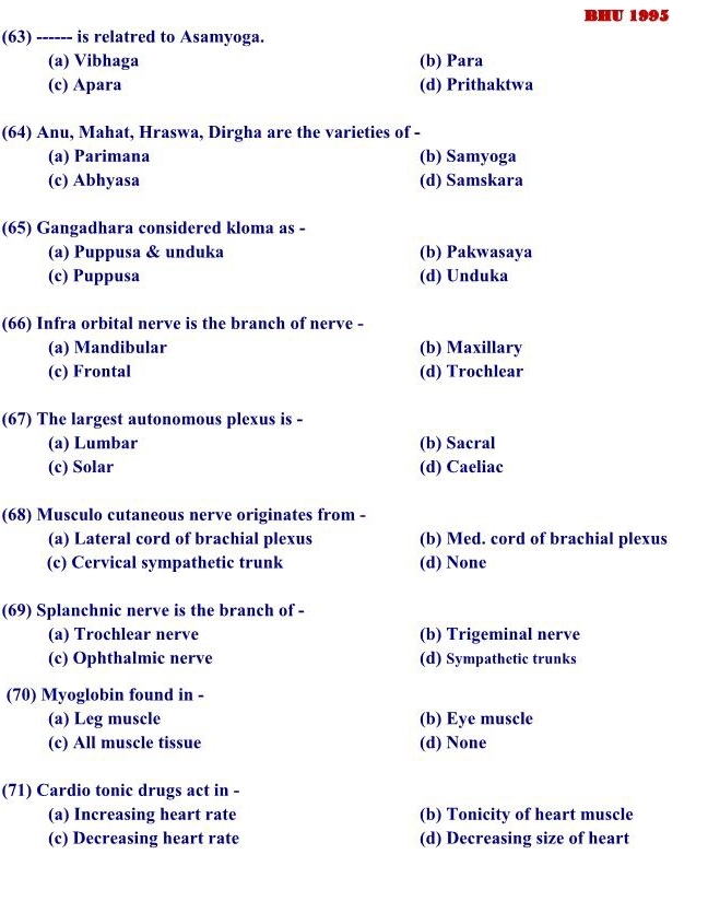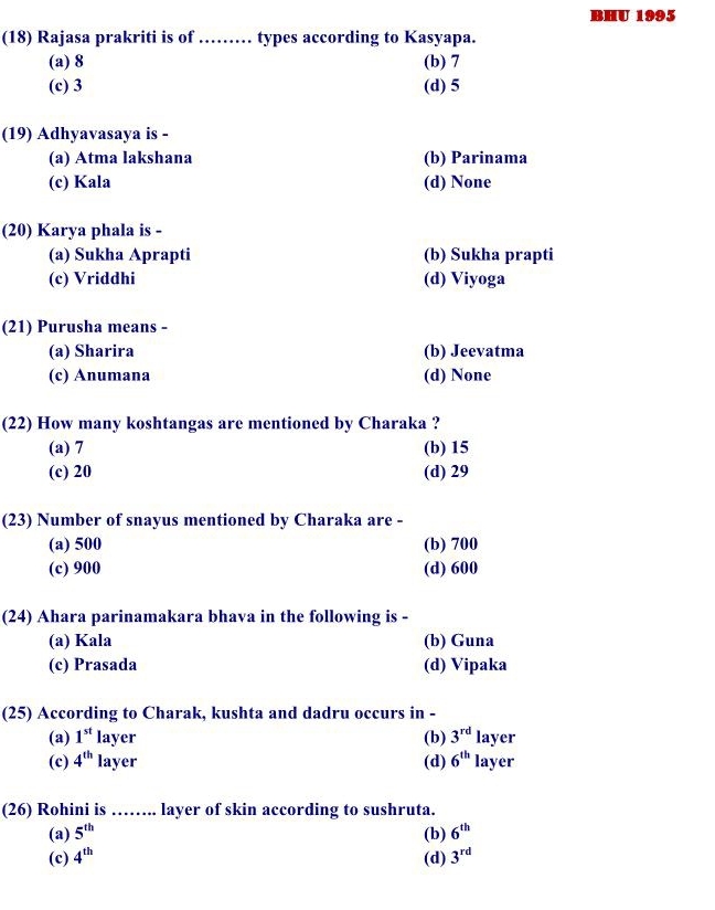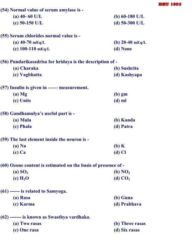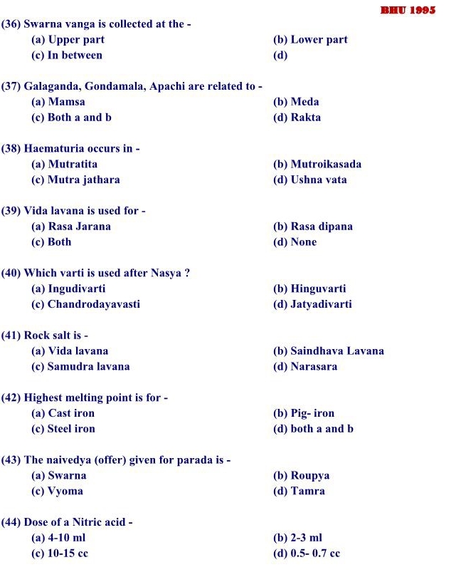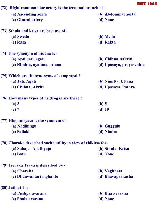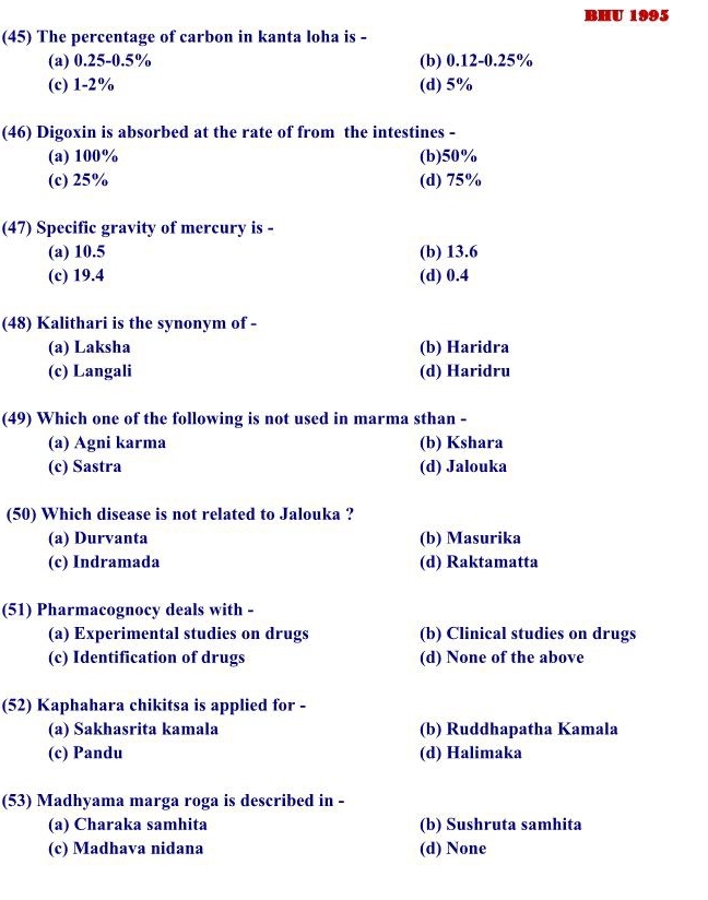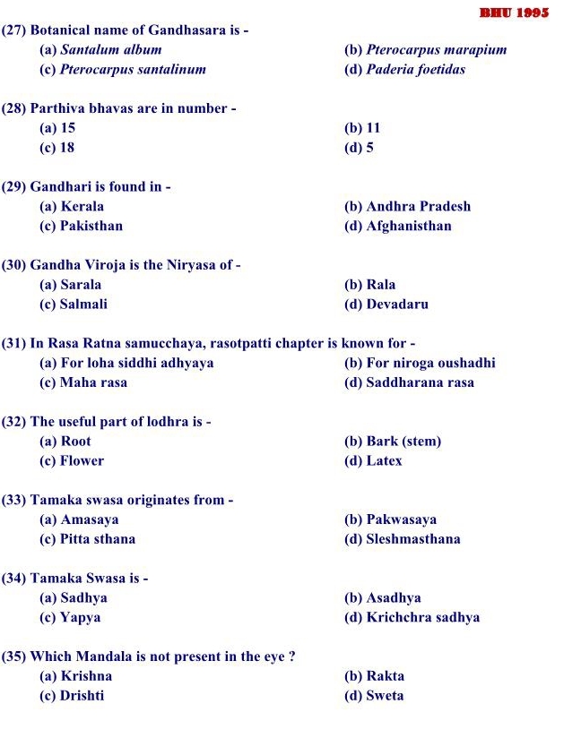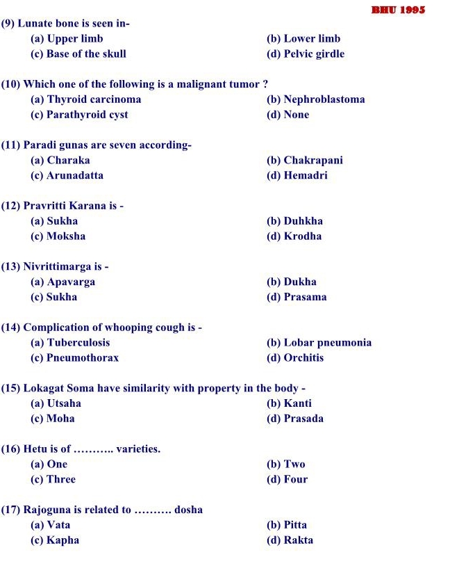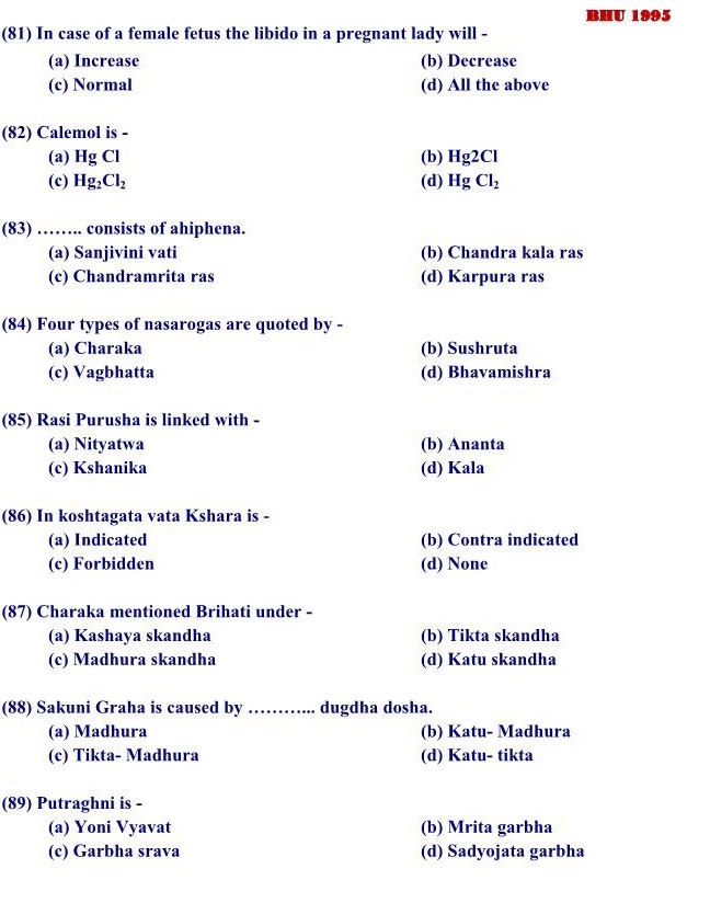 BHU Ayurveda PG Entrance examination 1995 Test Paper