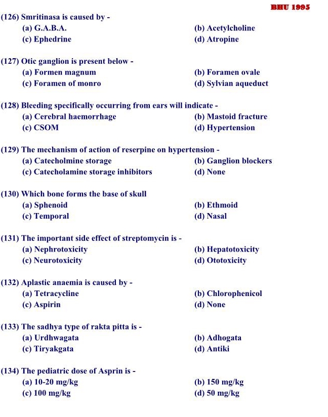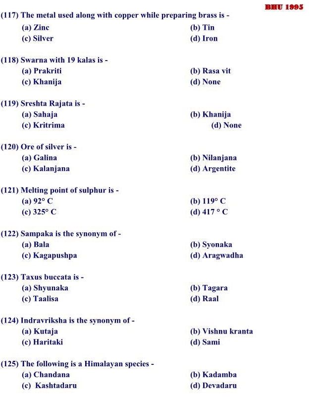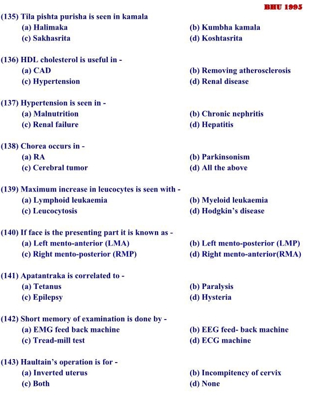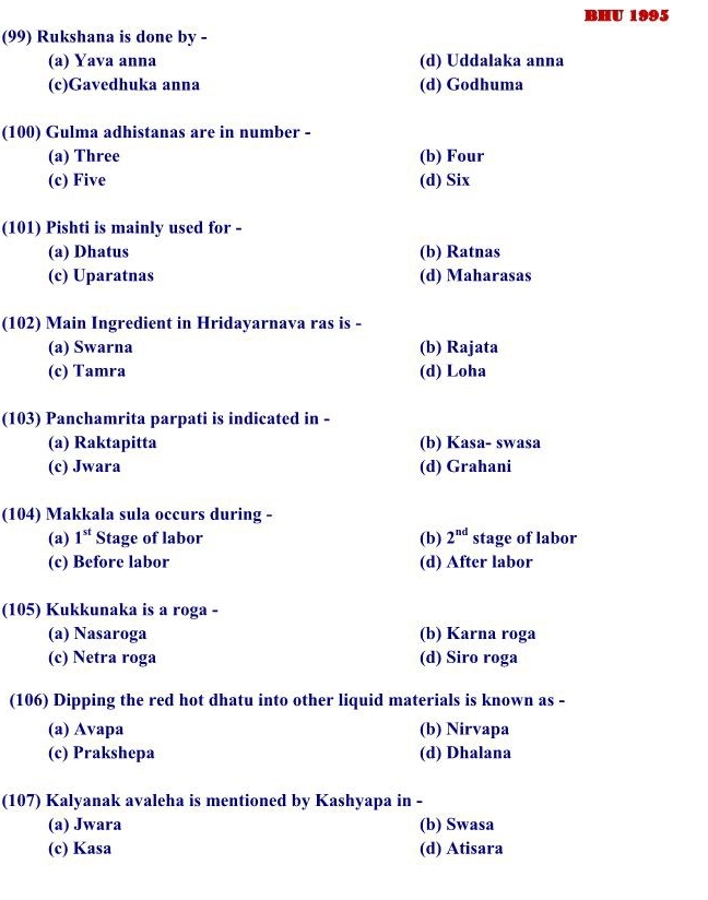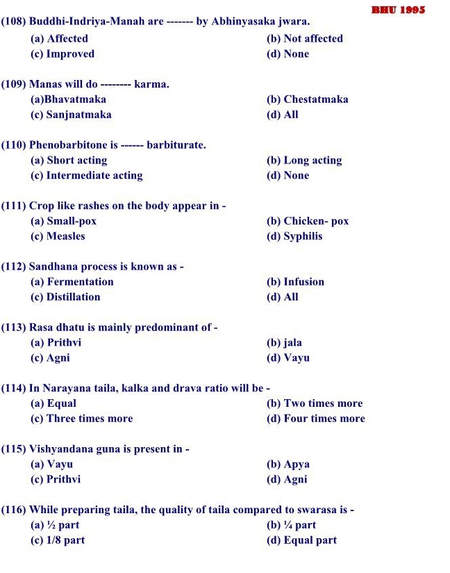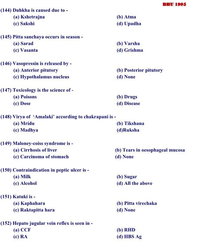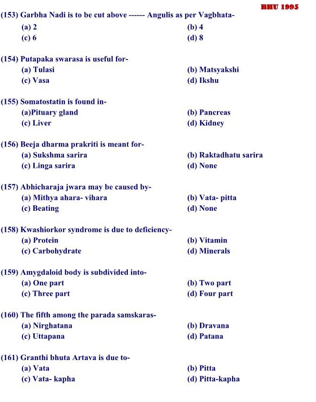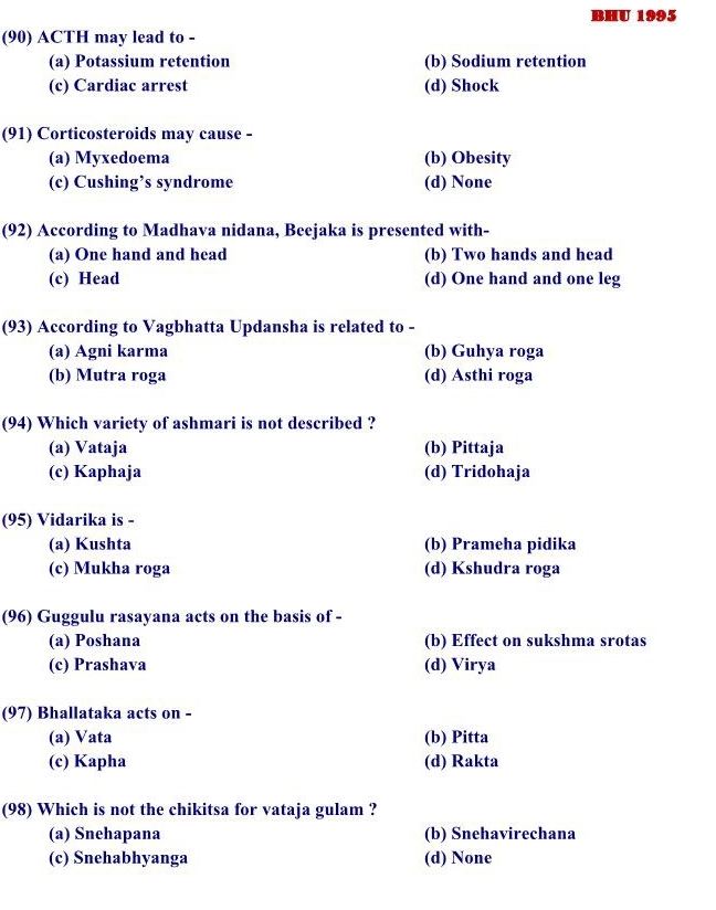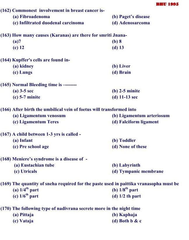 BHU Ayurveda PG Entrance examination 1995 Test Paper