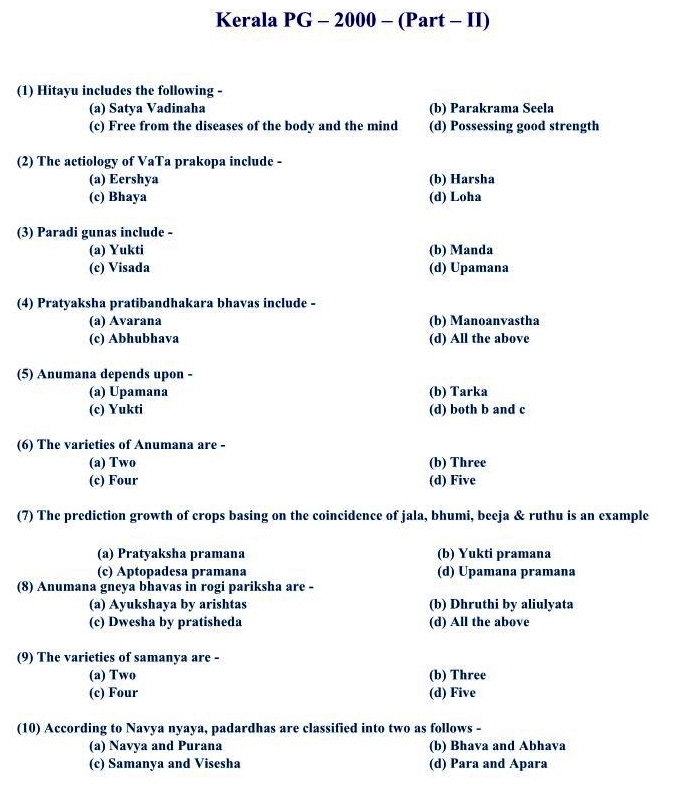 Kerala Ayurveda PG Entrance examination 2000 Test Paper