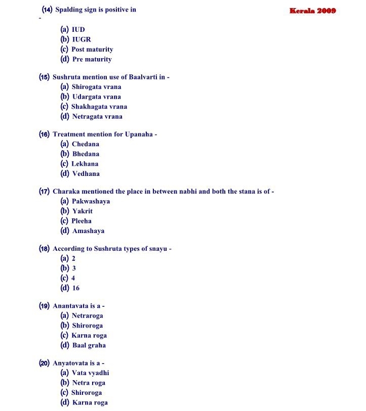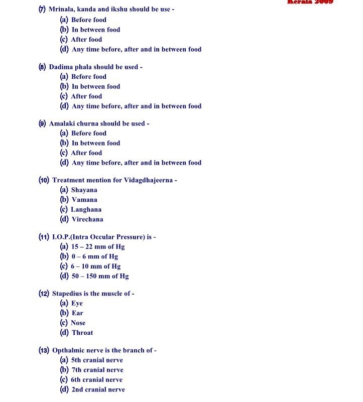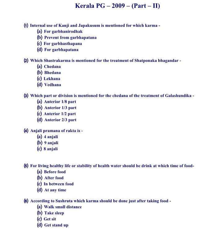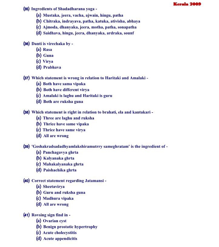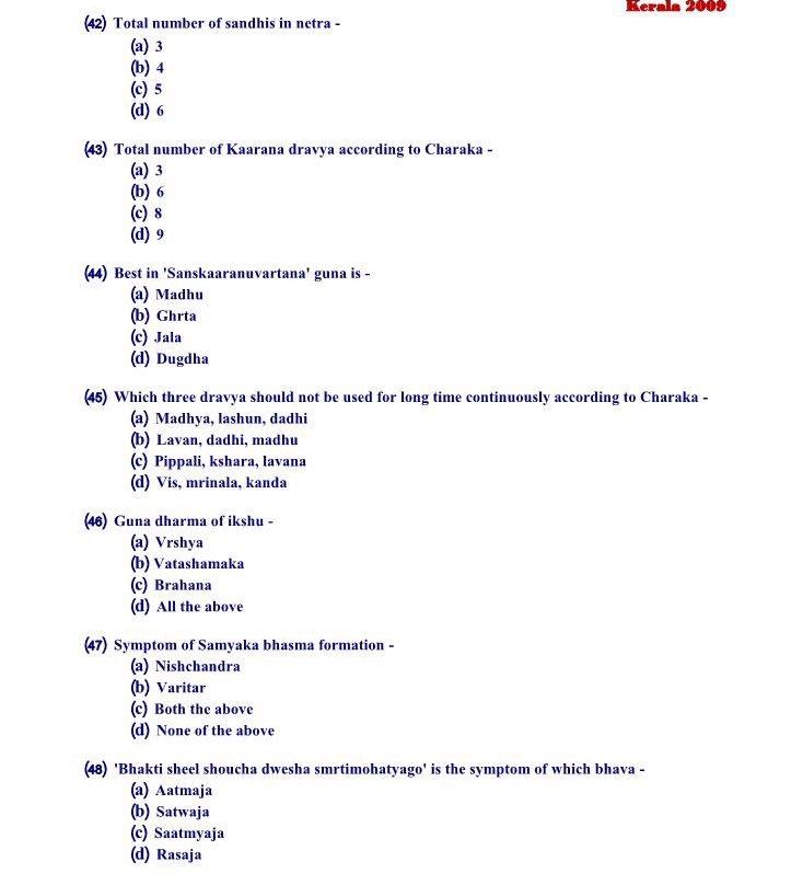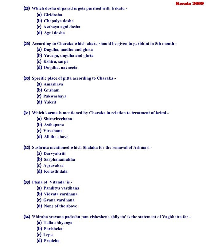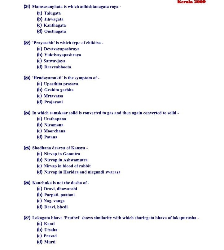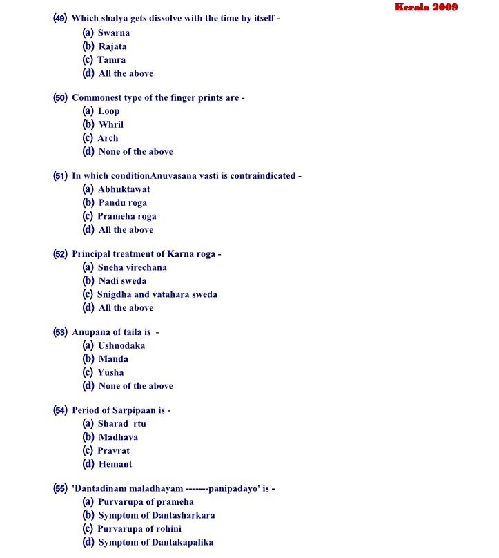 Kerala Ayurveda PG Entrance examination 2009 Test Paper