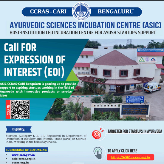 Call for Expression of Interest (EOI) under the Host-Institution Led Incubation Centre for AYUSH Startups, Support by CCRAS-CARI, Bengaluru.