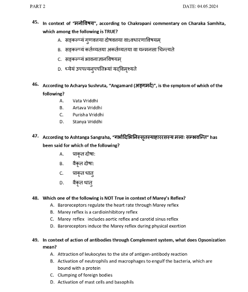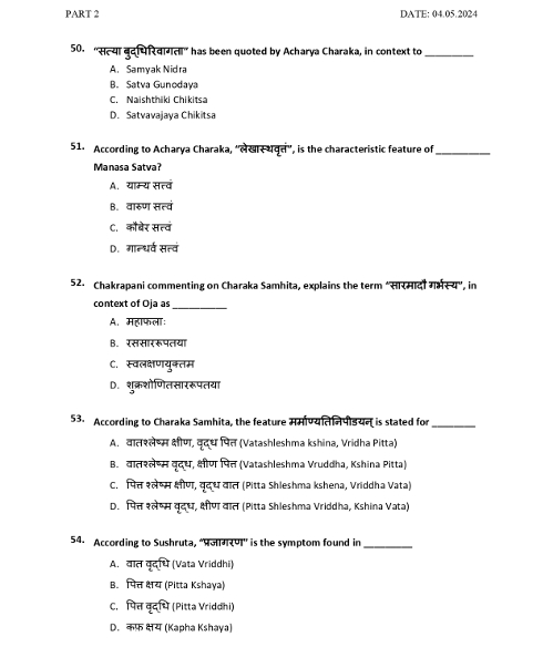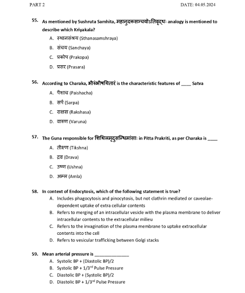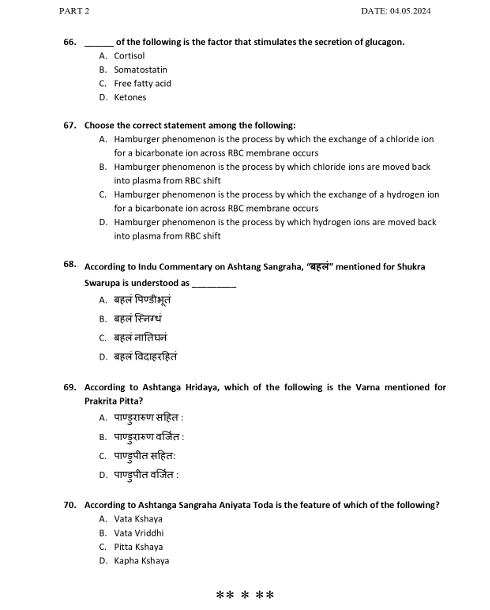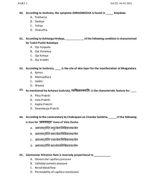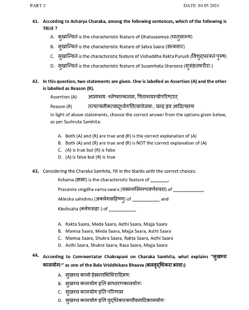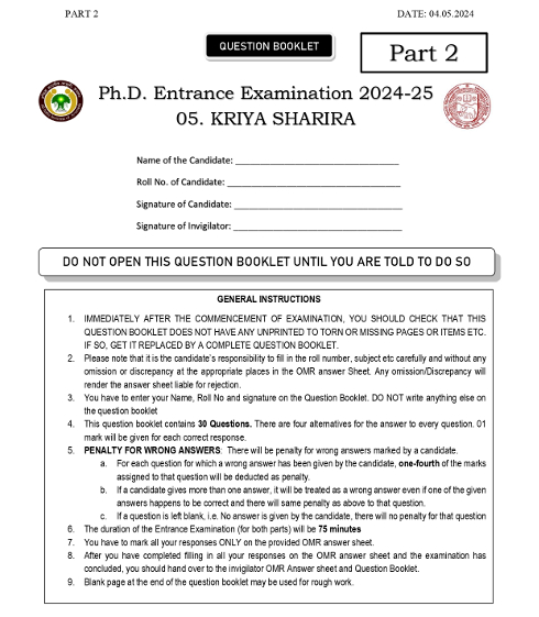 Ph.D Entrance Exam AIIA Kriya Sharira 2024 Test Paper