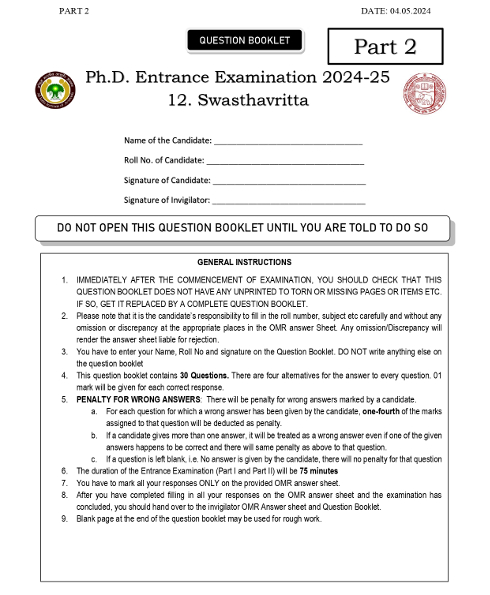 Ph.D Entrance Exam AIIA Swasthavritta 2024 Test Paper