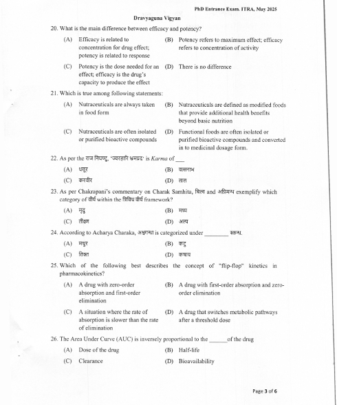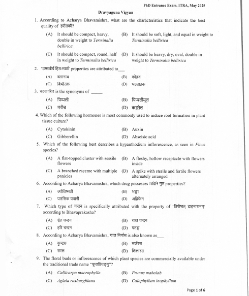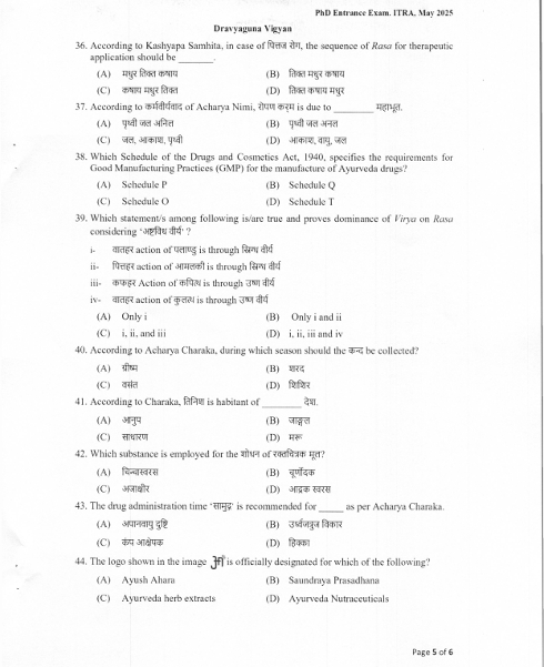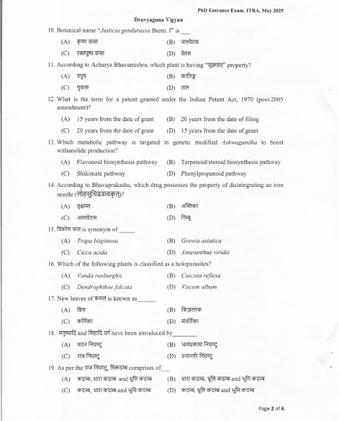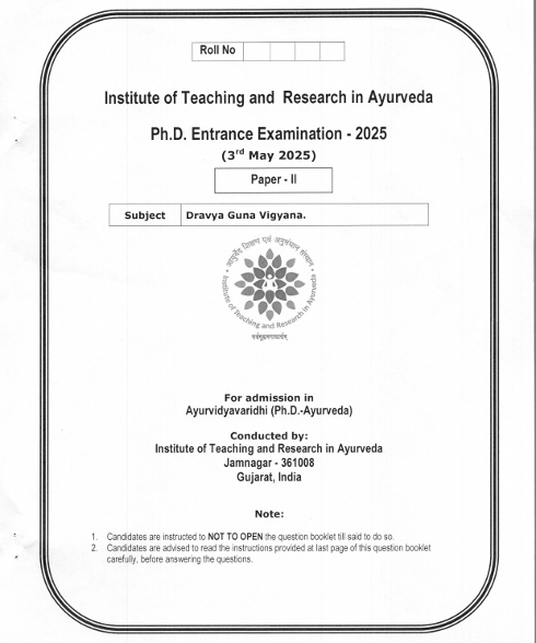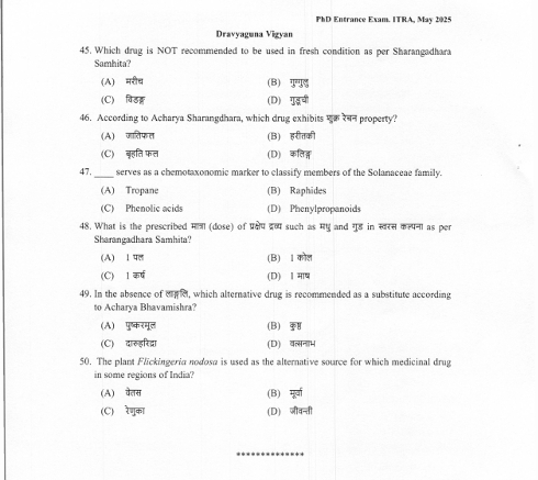 Ph.D Entrance Exam ITRA Dravyaguna Vigyana 2025 Test Paper