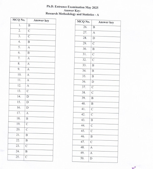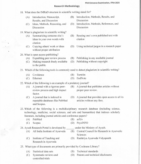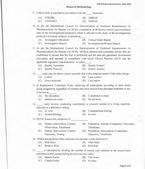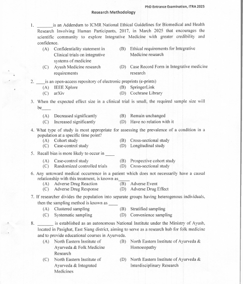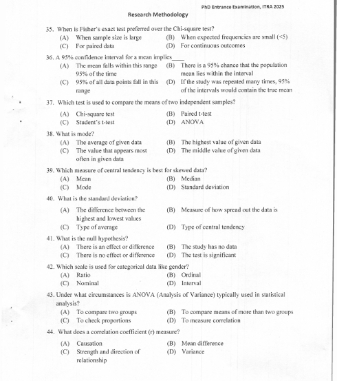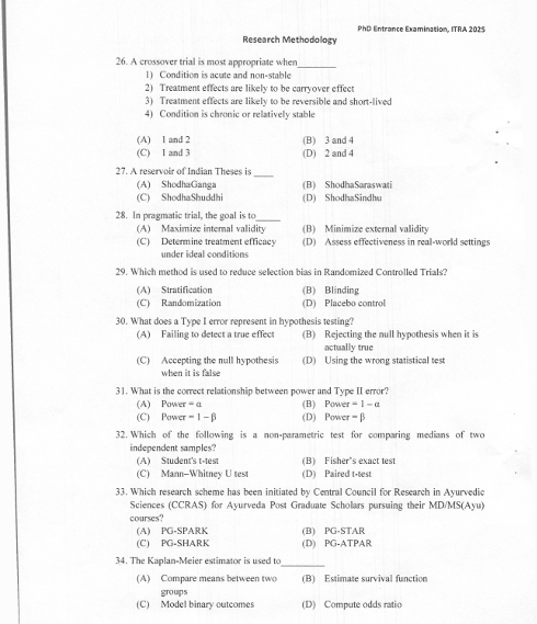 Ph.D Entrance Exam ITRA Research Methodology and Medical Statistics - A 2025 Test Paper