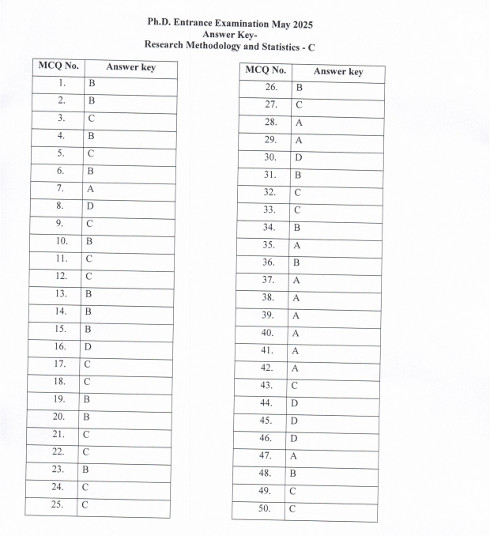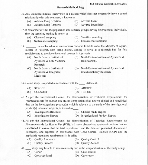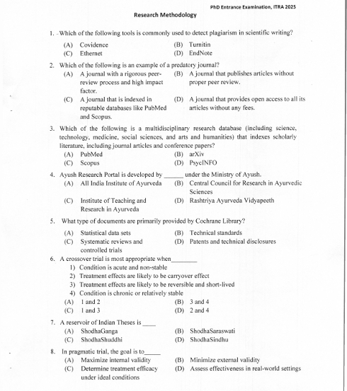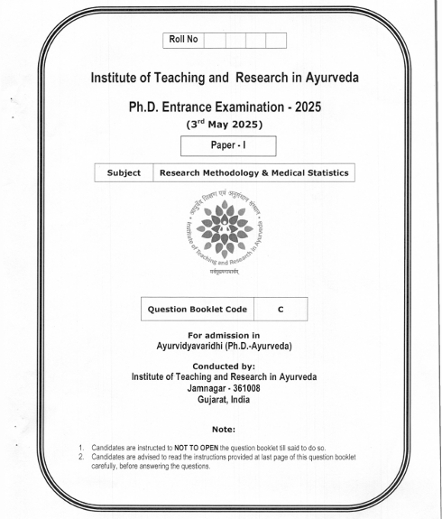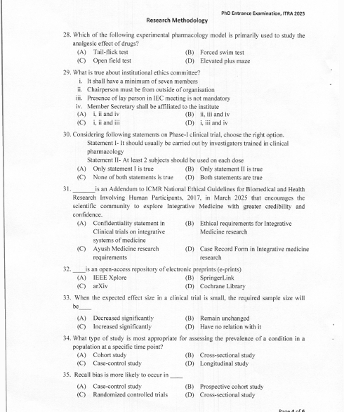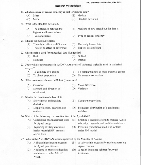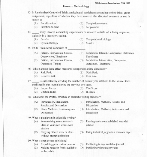 Ph.D Entrance Exam ITRA Research Methodology and Medical Statistics - C 2025 Test Paper