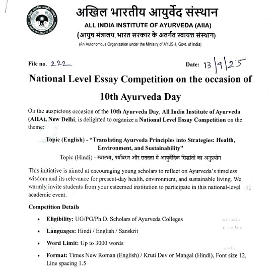 National Level Essay Competition on Translating Ayurveda Principles into Strategies: Health, Environment, and Sustainability, Organized by All India Institute of Ayurveda, New Delhi.