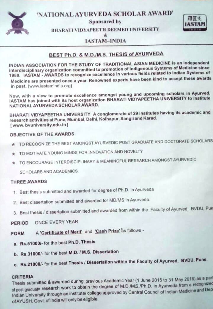 National Ayurveda Scholar Award: Best Ph.D. & M.D./M.S. Thesis of Ayurveda Announced by Bharati Vidyapeeth University.