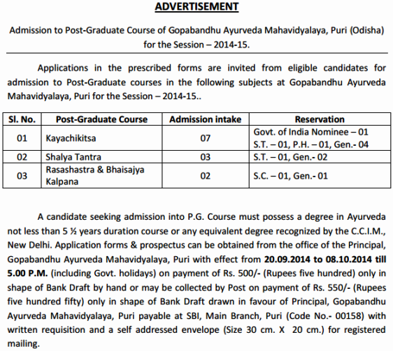 Admission Notice for Post Graduate Ayurveda Courses,