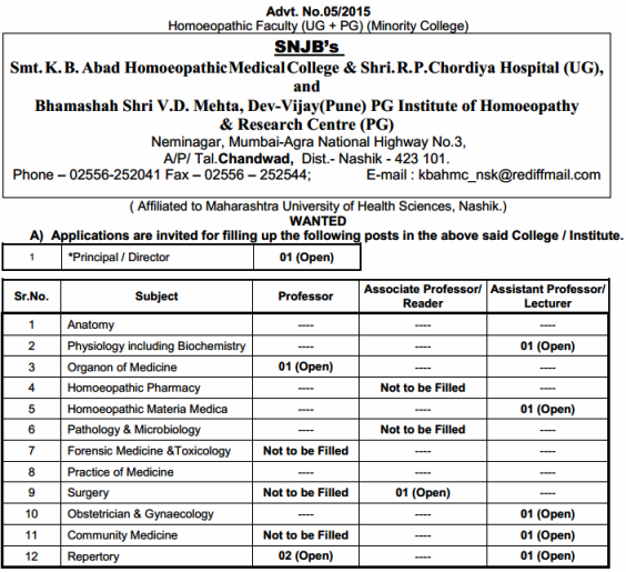 Vacancy for the post of Principal/Director,Professor,Associate Professor/Reader Assistant Professor/Lecturer, Smt.K.B.Abad Homoeopathic Medical College, Nashik.