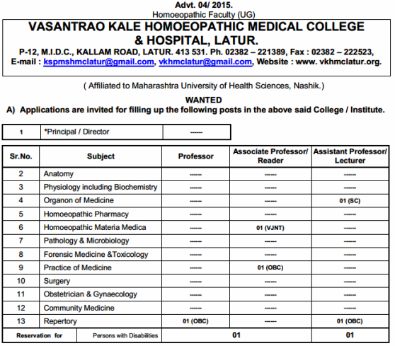Vacancy for the post of Professor,Associate Professor/Reader Assistant Professor/Lecturer, Vasantrao Kale Homoeopathic Medical College & Hospital, Latur.