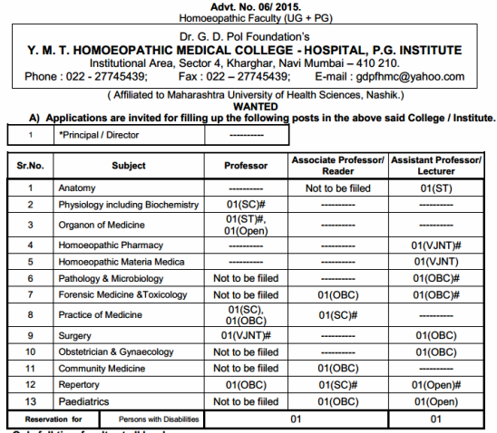 Vacancy for the post of Professor,Associate Professor/Reader, Assistant Professor/Lecturer, YMT Homoeopathic Medical College & P.G. Institute, Kharghar, Navi Mumbai.