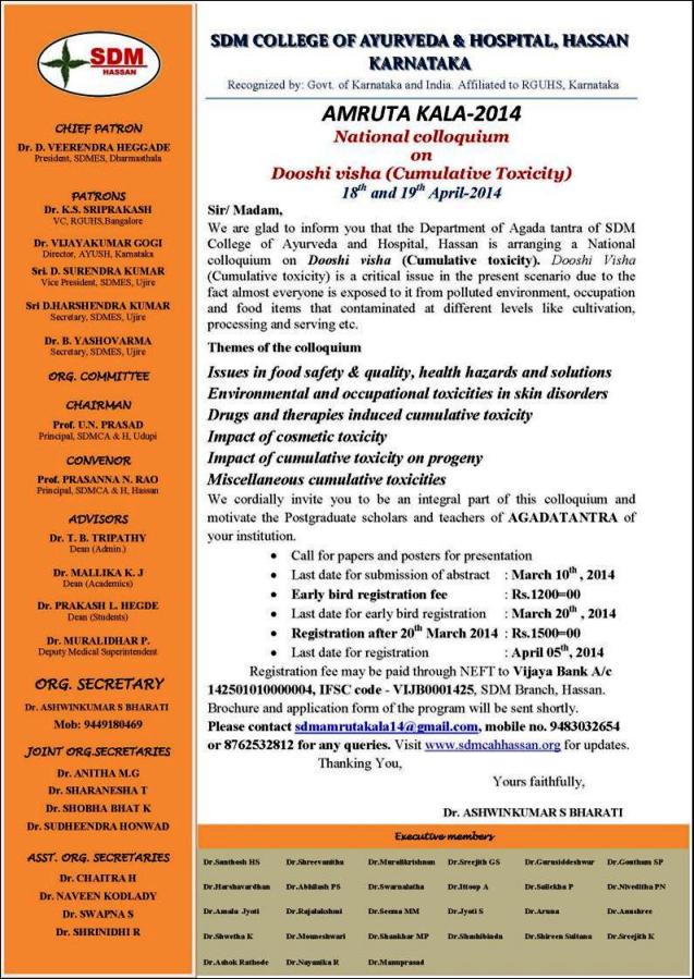National Colloquium on Dooshi Visha(Cumulative Toxicity) - Amrutakala-2014, organized by Sri Dharmasthala Manjunatheshwara College of Ayurveda & Hospital, Karnataka.