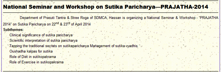 National Seminar and Workshop - "PRAJATHA 2014" on Sutika Paricharya, organized by Sri Dharmasthala Manjunatheshwara College of Ayurveda & Hospital, Karnataka.