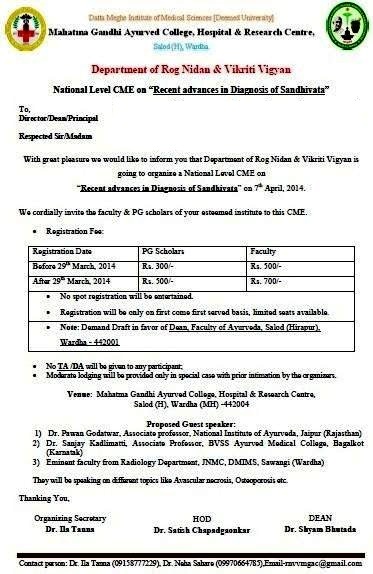 National Level CME on "Recent advances in Diagnosis of Sandhivata", organized by Mahatma Gandhi Ayurved College Hospital and Research Centre, Wardha.