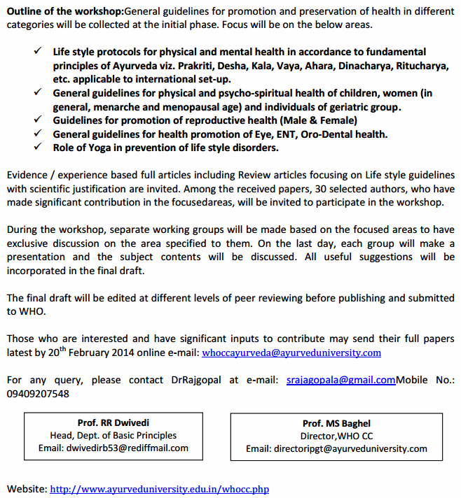 National Workshop for Development of Life Style Guidelines of Ayurveda for Rationalization and Standardization of Health Promotion, organized by Institute for Post Graduate Teaching & Research in Ayurveda,