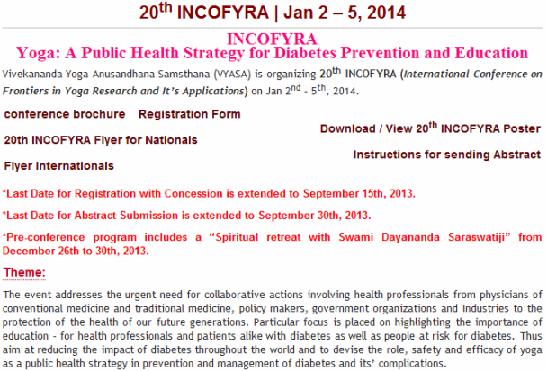 20th INCOFYRA(International Conference on Frontiers in Yoga Research and It's Applications), Yoga: A Public Health Strategy for Diabetes Prevention and Education,