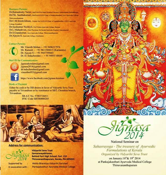 JAGNASA - 2014,A National Seminar on Sahasrayoga The treasure of Ayurvedic Formulations of Kerala organized by Vidyarthi Seva Trust At Pankajakasthuri Ayurveda Medical College,Thiruvananthapuram,Kerala.
