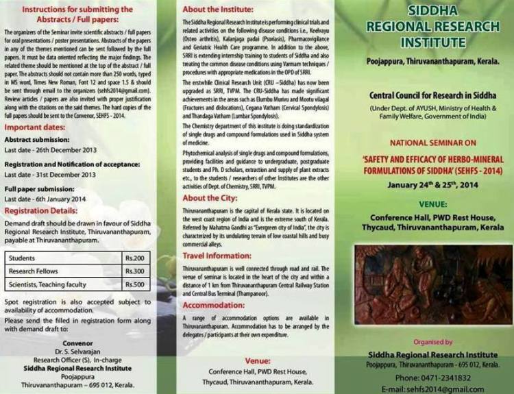 National Seminar On 'Safety And Efficacy of Herbo-Mineral Formulations of Siddha'(SEHFS-2014), organized by Siddha Central Research Institute,Thiruvananthapuram, Kerala.