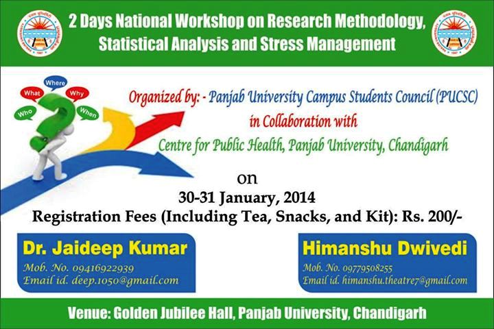 Two Days National Workshop on Research Methodology, Statistical Analysis and Stress Management, organized by Panjab University Campus Students Council (PUCSC) in Collaboration with Centre for Public Health, Panjab University, Chandigarh.