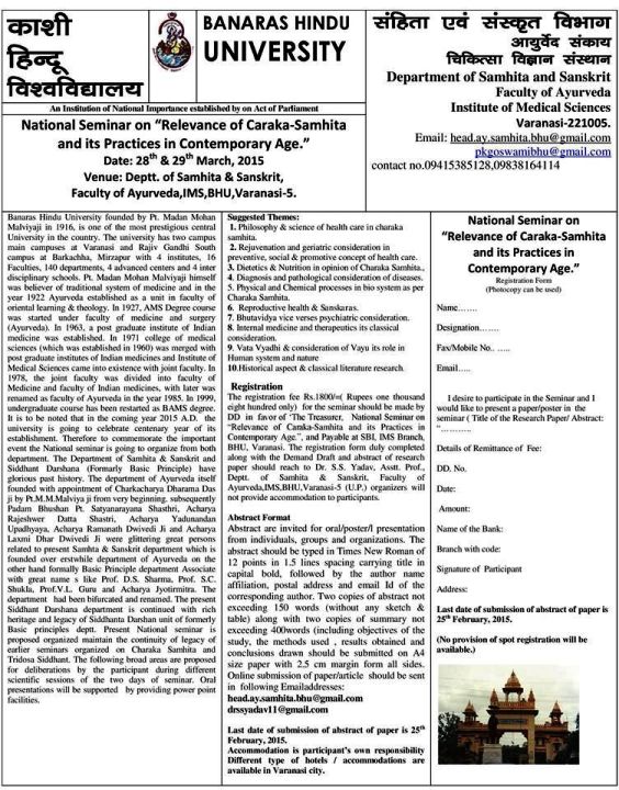 National Seminar on "Relevance of Caraka-Samhita and its Practices in Contemporary Age", organized by Deptt. of Samhita & Sanskrit,Faculty of Ayurveda,IMS BHU,Varanasi.